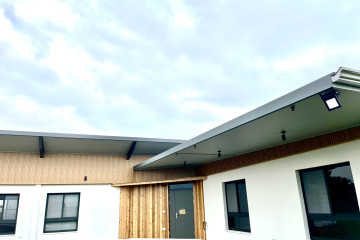 頂層特殊的屋簷及窗框設計,選用德國抗污塗料塗裝,與其他建材的搭配下,給予視覺合宜的留白。